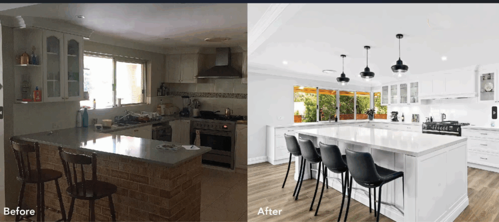 “The result is a modern, open-concept kitchen with elegant finishes and practical design. Neutral tones, soft lighting, and quality materials make this space perfect for cooking, hosting, and everyday comfort.”